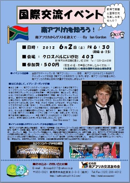 ★南アフリカからのゲストと「国際交流イベント」を行います★ 昨年 ステレンボッシュ大学 http://www.sun.ac.za/ を卒業、現在22歳。 卒業したステレンボッシュ大学には3回ほど行きましたが、非常にキレイで 素晴らしい環境のところです。 2010年には中国で行われた音楽祭で、このステレンボッシュ大学の合唱団は 世界一の栄誉に輝きました。それまでも、何度も優勝しています。 15歳まで「ドラケンスバーグ少年合唱団」に在籍し高校時代は「Boysアンサンブル」 で活躍していました。 新潟に滞在中、英語レッスンを兼ねた・