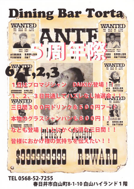 本当に本当に、おかげさまでDining bar Tortaは前オーナーから引継ぎ6月1日で5周年を迎えることができます