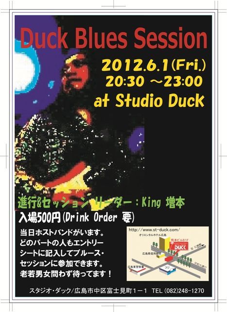 ダックで 『ブルースセッション』 やっちゃいますよ King Blues Session Vol.1 6月1日(金)20:30〜23:00 入場500円(ドリンクオーダー要) 場所:スタジオダック 進行&セッション リーダー:King 増本 当日は《King 増本》ひきいるホストバンドがいます。 ですので どのパートの人もエントリーシートに記入してブルースセッションに参加できます。 老若男女問わず待ってます! 歌い手さんも、 プレーヤーは、自分の楽器持って遊びに来てください!! 楽しめて 勉強になること間違いなしです