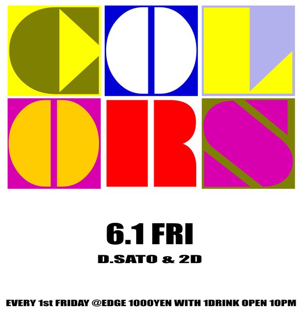 edge 第1金曜のCOLORS.です。 よろしくお願いします! ☆COLORS.☆ 2012.6.1 Friday @Edge ■Open 22:00 ■1000Yen With 1Drink ■Music By D.Sato & 2D □Underground Dance Music