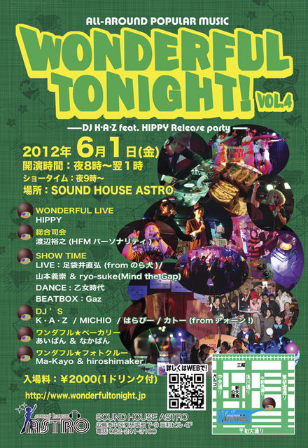 『WONDERFUL TONIGHT! VOL.4』 〜DJ K・A・Z feat.HIPPY Release party〜 開演時間:2012/6/1(金)夜8時〜翌1時 (ショータイム:夜9時〜) 場所:SOUND HOUSE ASTRO (地図:http://ww41.tiki.ne.jp/~s-do/astromap.html) 入場料:¥2000(1ドリンク付) ■ WONDERFUL LIVE HIPPY ■ 総合司会 渡部裕之(HFMパーソナリティ) ■ SHOW TIME LIVE:足袋井直弘(fromのら犬) / 山本義崇&ryo-suke(Mind the Gap) DANCE:乙女時代 BEATBOX:Gaz ■ DJ'S K・A・Z / MICHIO / はらぴー / カトー(fromアォーン!) ■ ワンダフル★ベ