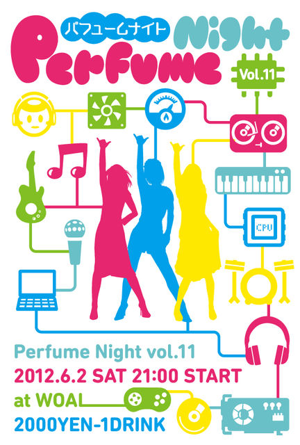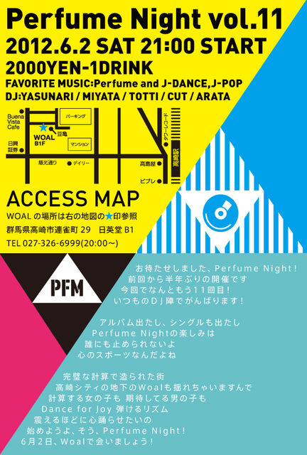 パフュームナイト開催します。6月2日 at Woal(高碕) 21:00 スタート! パフュームファンもファンでなくても楽しめる! はじめての方も楽しめる! 群馬一激熱のクラブイベント。 ■場所 Woal(高碕) 〒370-0826 群馬県高崎市連雀町29日英堂B1 TEL 027-326-6999 Perfume Night vol.11 2012.6.2 SAT 21:00 START 2000YEN-1DRINK FAVORITE MUSIC:Perfume and J-DANCE,J-POP DJ:YASUNARI / MIYATA / TOTTI / CUT / ARATA お待たせしました、Perfume Night! 前回から半年ぶりの開催です 今回でなんともう11回目! いつもの