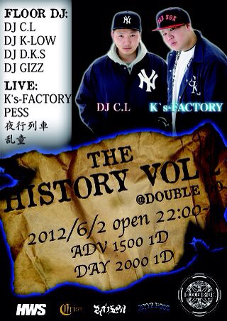 DOUBLE OOからBlack Musicを響かせます! 土曜日を最高の夜にしたい方は、ぜひお越しください! THE HISTORY VOL 2 @DOUBLE-OO 2012/06/02 【sat】 ADV 1500 1D DAY 2000 1D FLOOR DJs C.L K-LOW D.K.S GIZZ LIVE K's-FACTORY PESS 夜行列車 乱童 Fryer Design HWS CLOTHING キャッシャーで、 DJ CLと言っていただければ、前売りチケットの価格で入場可能なので、よろしくです! 楽しみましょう!