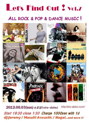 2012.06.03(sun) @音溶 Let's Find Out! Vol.7 Start:19:30 - 1:30 DJ:Jeremy / Masaki Acoustic / Nagai ...and more! 1,000yen with 1d ALL ROCK & POP & DANCE MUSIC ! ロック、エレクトロを中心に、ジャンルレスなGOOD MUSICをセレクト。 最新のインディー・エレクトロで踊りましょう! ■Party Info http://www.oto-doke.com/schedule/s_news.cgi#204 (PC) http://photozou.jp/photo/show/703820/137077007 (携帯) ■音溶 愛媛県松山市三番町二丁目10-9第3クリーンビル3F ★WEB http://www.oto-doke.com/ ★