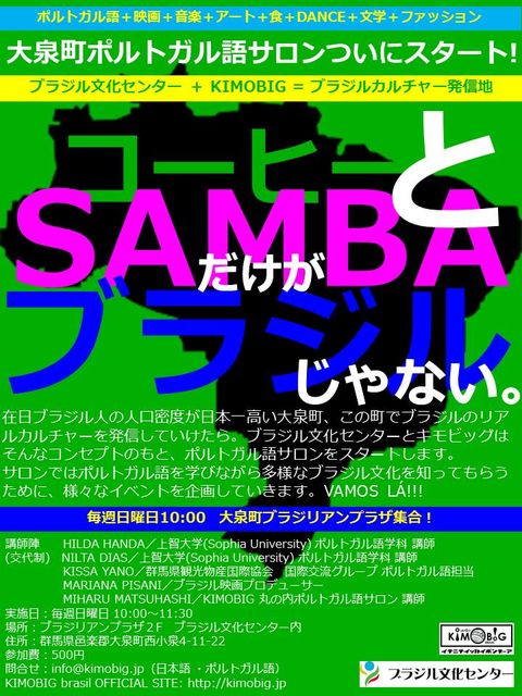 ブラジル文化センター/KIMOBIG共催 お待たせしました。ブラジル文化センターとキモビッグの共催によるポルトガル語サロンが2012年6月3日(日)より群馬県大泉町でスタートします。 講師陣も超豪華!ブラジルタウン大泉町ならではのブラジルカルチャーに触れ、明日使えるポルトガル語を学びましょう! ポルトガル語+映画+音楽+アート+食+DANCE+文学+ファッション… 「コーヒーとサンバだけがブラジルじゃない。」 ブラジル文化センター + KIMOBIG = ブラジルカルチャー発信地 南米大陸で最大の面積を誇り、2014年のサッ