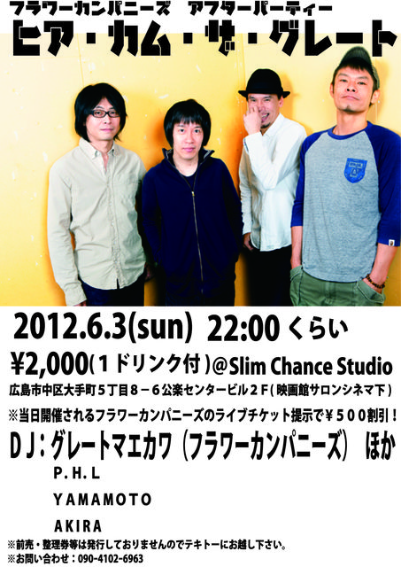 管理人様、告知失礼します! 6月2日(土)・6月3日(日) フラワーカンパニーズ 「春チェスト!初夏チェスト2012」 @ナミキジャンクション \3300(要1ドリンクオーダー) 6/3(日)のライブがが終わったあとに、広島恒例アフターパーティー「 ヒア・カム・ザ・グレート」が今回も行われます! ライブが終わったあとはゼヒお越しください! ※イベントは6/3です。6/2は行いませんのでご注意ください! 6月3日(日) 「ヒア・カム・ザ・グレート」 open/start:22:00 スリムチャンススタジオ http://slimchance.exblog.jp