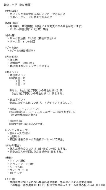 どうも、管理人のちくりんです。 BCHリーグの第15シーズンは2012年6月3日から開始します。 開催日は今までどおり毎月第1、第3日曜日で時間は17時からです。 連休中などにより日程が少し異なることがあります。 開催回数は参加人数により変動しますが、大体6回〜8回程度です。 詳しい詳細については別途ご連絡いたします。 参加資格、参加費等は下記を参照ください。 【リーグ】BCHリーグ 連絡板 http://mixi.jp/view_bbs.pl?id=18631001&comm_id=500034