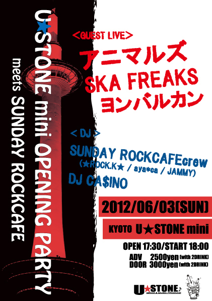 『U☆STONE mini OPENING PARTY meets SUNDAY ROCKCAFE』 6/3 (日) 開場 17:30 開演 18:00 前売 2500円 / 当日 3000円 (with 2drink !!) 出演 -GUEST- アニマルズ / SKA FREAKS / ヨンバルカン -DJ- SUNDAY ROCKCAFE CREW(★ROCK.K★ ayaca JAMMY) / CA$INO / and more.. ◇U☆STONE miniのオープンをROCK DJ CREWのSUNDAY ROCKCAFEが祝いに来てくれます! バンド陣も名古屋の雄アニマルズを始めとしてパワフルな3バンドがそろい、楽しむしかない1日です!!
