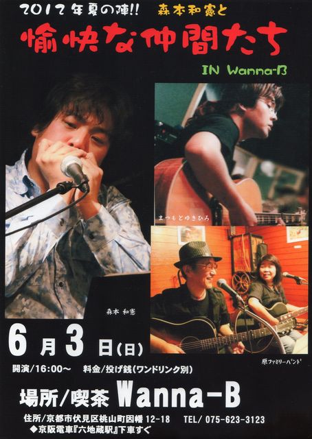 ◆タイトル:『森本和憲と愉快な音楽仲間たち2012〜夏の陣〜』 場所:喫茶&Bar「Wanna−B」 住所:京都市伏見区桃山町因幡12−19 (京阪電車六地蔵駅降りて1分です) 開演:16:00〜(若干当日の会場の様子によって前後します) ゲスト:まつもとゆきひろ(シンガーソングライター) 原ファミリーバンド(フォークデュオ) 料金:投げ銭 ☆またライブ終了後、お時間の許される方、演奏できる方は 是非ス