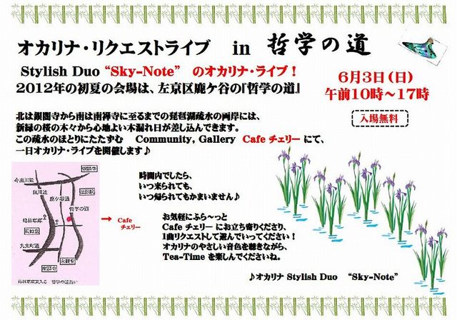 京都市左京区鹿ケ谷の 「哲学の道」で Sky-Noteがリクエスト・ライブに挑戦します!!! 哲学の道は、南禅寺から銀閣寺に至る琵琶湖疏水の河畔を 哲学者の西田幾多郎が散策しながら思索にふけったことから その名前がついています。(写真1) 哲学の道の中ごろ、カフェ「チェリー」(写真2)での ライブです。 いつもは、決まった曲を順番に演奏するだけでしたが、 今回は、リクエスト・ライブに挑戦!!! 聴きにきていただいたお客さんから リクエストをいただいて 演奏してみようかということになりま