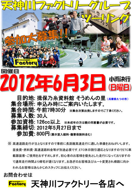 目的地:揖保乃糸資料館 そうめんの里(兵庫県たつの市) 集合場所:申込み時にご案内いたします。 集合時間:午前7時30分※集合次第出発いたしますのでご了承下さい。 募集人数:30人 参加資格:126cc以上 募集締切:2012年5月27日 参加費:800円(展示室入館料・傷害保険料含む) ※ 高速道路走行が主になりますので事前に長距離走行に適した準備をおねがいします。 昼食費・燃料費・高速道路料金等が別途必要です。 ETC休日割引適応となりますのでETC車載器装備・ご使用をおすすめします。 初心者のお客様を優先とした走行になっておりま