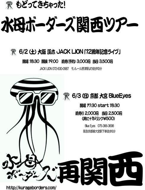 ■6月3日(日) 水母ボーダーズワンマンライヴ open17:30/start18:30/adv¥2000 door¥2500 (共に+1drink¥500) 出演:水母ボーダーズ ♪水母ボーダーズ 2008年始に湘南で結成された変態DISCOバンド。 歌うパパラッチ「トら」を筆頭とする水母ボーダーズは、日本をシマシマにするべく活動中である! 『キモイけど知らぬ間に踊ってる』、『エロやか』と評判をたてられてる我々ですが、寒天質な性質に関わらず骨のあるサウンドで貴方を痺れさせちゃう。 MENBERはvoトら(水母暁)、 keyT−無門(水母操)、 b大沢イツト(水母勲)、 dr福井豊(水母豊)