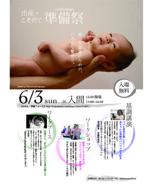 6月3日(日)14時〜17時@埼玉県入間市 第2回 出産・こそだて準備祭in入間 開催決定! http://kokucheese.com/event/index/34461/ ご予約・お問い合わせ NPO法人日本カルチャーヨガ協会 TEL 04-2939-8967 E-mail kr-osaka@nifty.com ★★★★ これから生まれてくる子ども達のために。そして、その子ども達を育てていくパパ・ママのために。前回、西国分寺で開催し、大好評だった出産・こそだて準備祭の第2回目が早くも開催されます! 準備祭では、出産やこそだてをサポートしている様々な活動をしている人たちと、今まさに