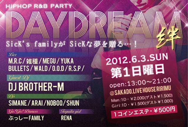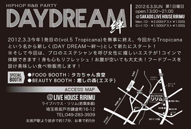 埼玉県・坂戸市で行われるイベントにゲストDjにて出演します いつも"SLAM"で共演しているM.R.CなどsicK's Familyにお招き頂きました Thanx "SLAM"のメンバーも多数出演しますので、是非遊びに来てくださいネ -------------------------------------------------------------------------------- 【DAYDREAM〜絆〜】 2012.06.03 sicK's familyがsicKな夢を贈る… 今回よりネーミングも"Tropicana"から新しく"DAYDREAM〜絆〜"として新たにスタート!
