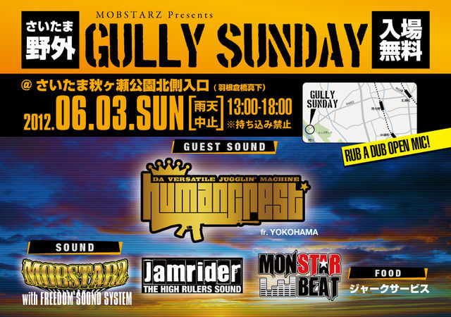 2012夏期毎月第1日曜にさいたま市秋ヶ瀬公園北側で行われる野外ダンス『GULLY SUNDAY』通称ゴリサン!! 男女入場無料で遊べます♪ 毎回子供から大人まで幅広い客層で気軽に楽しめるReggaeイベントです★ お得に遊べる『GULLY SUNDAY』普段クラブに行けない方も、美味しいお酒片手にReggaeを中心にMOBSTARZのSound systemから流れる Good Musicで自由気ままに踊りましょう。 ジャークサービスによるジャークチキンも販売いたしております。 そして毎月、各地地元でダンスをKEEPし活動している SOUNDを招き大盛り上がりしてます!! 6