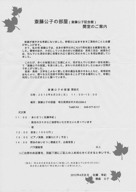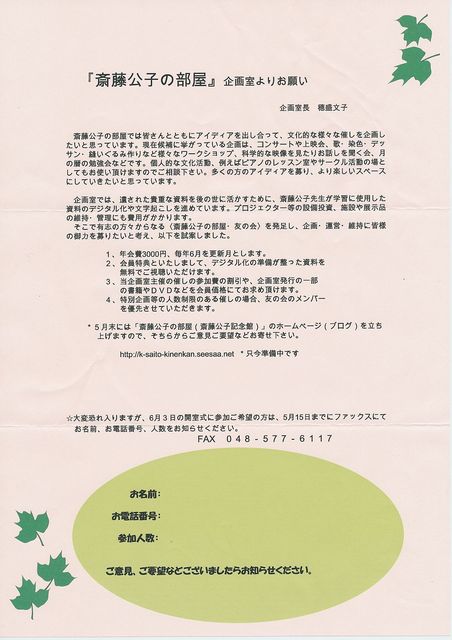 3年前の3月、沖縄での保育指導の後、4月16日、急逝された斎藤先生。 http://www.youtube.com/watch?v=K9Su2RN55Xw このたび、ご子息の佐藤幸紀さんが斎藤先生の蔵書などをご利用いただくための施設として、先生の旧宅跡に斎藤公子の部屋を開かれます。 ここの企画室長は、 DVDブック「子どもたちは未来 ー乳幼児の可能性を拓くー」の監督、穂森文子さん。 http://www.youtube.com/watch?v=QULQ_6hVd9Q&feature=related 開室式は6月3日11〜15時。昼食代のみ1000円。 参加申し込みは、5月15日まで、Fax048-577-6117 この部屋の友の会