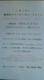 日 時 平成24年6月3日(日) 8時30分開場 9時開会 会 場 所沢市民体育館 種 目 男子団体、女子団体 試合方法 4S1Wのリーグ戦の後、順位別トーナメント 参 加 費 1チーム4000円 参加資格 オープン 〆 切 り 5月21日(月) 当日のメンバー変更(例 A→B、B→A)の変更は認められません。 申し込みまで余裕を持ちたいので サウス内での〆切りは11日までとします。 副管理人は少ないお小遣いで日々を必死に生きています 早めに集金したいのでご協力