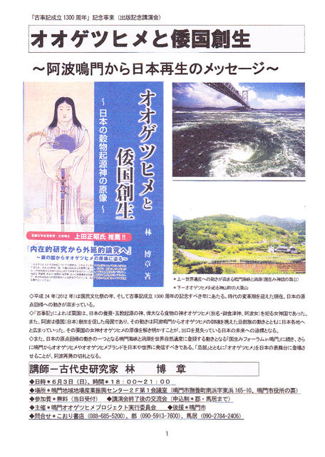 このたび、徳島の鳴門で出版記念講演会を開催する運びとなりました。ご都合つきますれば、お越しくださいませ。 「古事記成立1300周年」記念事業(出版記念講演会) オオゲツヒメと倭国創生〜阿波鳴門から日本再生へのメッセージ〜 ◇平成24年(2012年)は国民文化祭の年、そして古事記成立1300周年の記念すべき年にあたる。時代の変革期を迎えた現在、日本の原点回帰への動きが高まっている。 ◇「古事記」によれば粟国は、日本の養蚕・五穀起源の神、偉大なる食物の神オオゲツヒメ(別名・御食津神、阿波女)を祀る女神国であった。