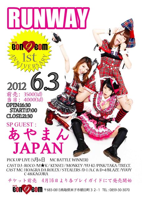 RUNWAY〜BON9BOM 1st Aniversary〜 6月3日(日) 前売3500円(1D)当日4000円(1D) CAST DJ : ROCO /M★K / KENSEI / MONKEY /YU-KI /PINK/TAKA /TRECE CAST MC: HOAGRA DA ROLEX / STEALERS /D-I /A.C & D×4/BLAZE /YUUY/C-4&KAGURA support by M★K K's Lively sugar GOz HAIR MAKE DANCE DNA TOPSTAR ぐでんぐでん ホアグラ水産 プレイガイド (米子市) TSUTAYA 角盤町店 0859-31-6222 sugar K's Lively 0859-31-5387 HAIR MAKE DANCE 0859-32-0113 Bon 9 Bom 0859-30-3070(FAXのみ受付) (