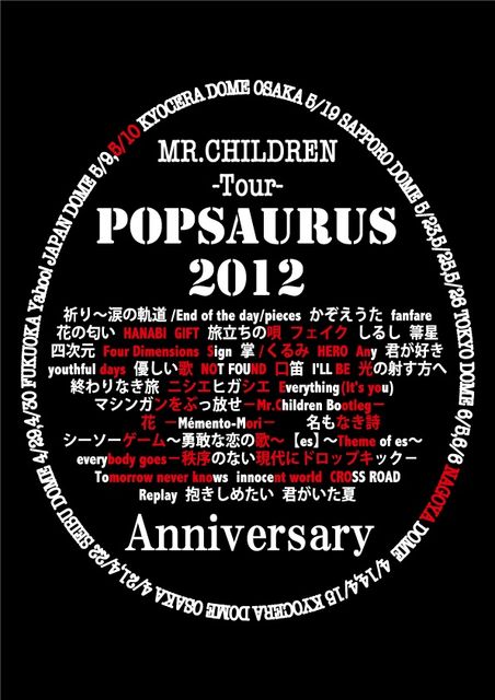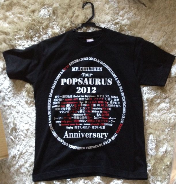 こんにちは ( ´ ▽ ` )ノ 「MR.CHILDREN TOUR POPSAURUS 2012」開催に伴い、 より一層ツアー参加を盛り上げるために、オリジナルTシャツを作成しよう! という企画の☆追加募集☆です♪ 【応募期間】5/17(木)23:59まで 【Tシャツの概要】 歴代シングル曲をリリース順に並べ、20周年の「20」の文字を赤色で表現。 ツアー日程を「卵」型に並べ、デビュー記念日の「5/10」と ツアーファイナル?の会場「NAGOYA」の部分を赤文字で強調させた仕様。 【サイズと1枚あたりの価格】(価格差有り) 大人用:XS(160)/S/M/L/XL→ \2,
