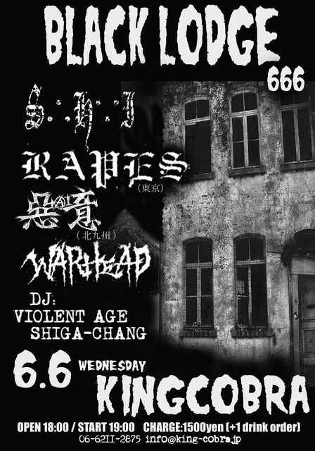 -BLACK LODGE 666- 2012.6.6(wed) at osaka KINGCOBRA S.H.I RAPES WARHEAD 惡AI意 DJ: VIOLENT AGE SHIGA-CHANG 開場 18:00/開演 19:00 ADV. 1,500/DOOR 1,500 チケット取扱い KING COBRA