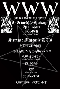 さのちゃんDJします。 2012.6.6.wed HOKAGE presents [WWW] OPEN: 18:00 START: 18:00 Adv. 666yen Door. 666yen -LIVE- 不幸 -DJ- SCUMZONE EL TOPO UTERODDDJJJ 風輝<fu-ki>(MiDian,METAL NIGHT) 悪魔大根 ISO(BIRUSHANAH)