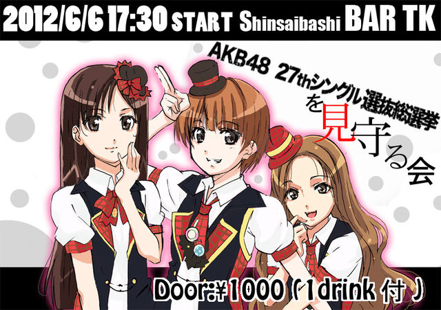 《AKB48 27thシングル 選抜総選挙 を見守る会》 supported by idol☆club & さきおた!! ■日時 2012年6月6日(水) 17:20 開場 17:30 開演 ■会場 心斎橋アメリカ村 BAR TK 大阪市中央区西心斎橋1816 中西ビル6F http://goo.gl/36ycJ (アメリカ