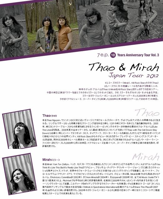 7e.p. 10Years Anniversary Tour Vol.3 『Thao & Mirah Japan Tour 2012』 2012.6/6(水) 19:00open 19:30start 予約¥3300 当日¥3800(ドリンク別) 出演: Thao & Mirah (各ソロセット含む) オオルタイチ+ウタモ Kレコーズのミラー(Mirah)、Kill Rock Starsのタオ(Thao)、USノースウエストの老舗レーベルを代表する歌姫二人の昨年のデュオ・アルバム『Thao & Mirah』(Kill Rock Stars)を引っさげての日本ツアー。今回の来日公演はドラマーを迎えてのタオ&ミラーとしてのセットに加え、 タオ、ミラーそれぞれのソロ・セッ