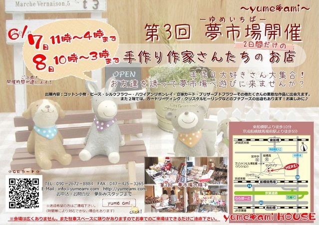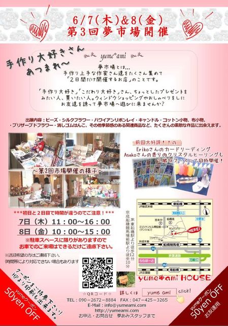 夢市場とは... 手作り上手な作家さん達をたくさん集めて 「2日間だけ開催するお店」のことです 「手作り大好き」「こだわり大好き」さん、 ちょっとしたプレゼントを みたい人、買いたい人。ウィンドウショッピングやおしゃべりをしに お友達を誘って夢市場へ遊びに来ませんか? 出展内容: ビーズ・シルクフラワー・ハワイアンリボンレイ・キャンドル・コットン小物、 ・プリザーブドフラワー、その他たくさんの素敵な作品に出会えます。 今回も、カードリーディング・ヒーリングブーズの出店もあります! お楽しみに
