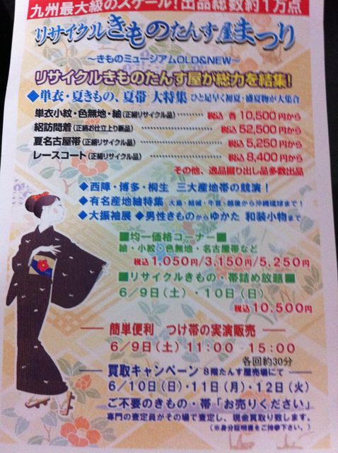 突然すぎてすみません 6/7に博多阪急8階の催事場のたんす屋さんのセールに行こうと思っています。 どなたかご一緒してくださる方いらっしゃいませんか? 阪急8階の催事場に13時ごろに集合できれば・・と思います。 私は8階にあるフードコートでお昼を食べようかと思っていますので、お昼ご飯をもご一緒してくださる方は12:30に阪急8階のフードコートに集合でお願います 本当に突然ですみません。 ご都合が合う方がいらっしゃればよろしくお願いします。 着物でのご参加がうれしいですが、天候や体調・ご都合によっ