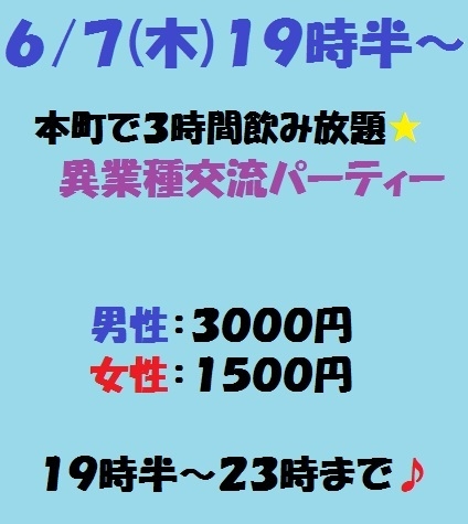 6月7日は19時半〜 オシャレなイタリアンで 異業種交流・友達作りの 交流パーティーです!(^^) 私たちのミッションは 出会いを通じて、参加者の人生に貢献すること です(^^) 軽い男女の出会いではなく、 仲間との出会い、 知識との出会い、 新しいアイディアとの出会い、 パートナーとの出会い そういった全ての出会いを通じて、 プラスな人生を送って欲しいと心から願っています! 今回のパーティーを 入り口として活用してくださいね♪♪ 初めて参加される方には、