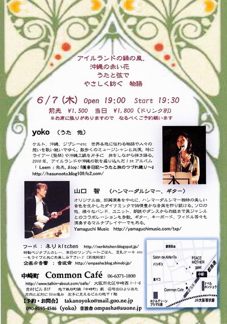告知失礼します。 2012.6/7(木) 19:00open 19:30start 予約¥1500 当日¥1800(ドリンク別) アイルランドの緑の風、沖縄の赤い花 うたと弦でやさしく紡ぐ物語・・・ 出演: ■yoko(唄ほか) ケルト、沖縄、ジプシーetc 世界各地に伝わる物語や人々の想いを歌い継いでゆく。数多くのミュージシャンと共演。時にライアー(竪琴)や沖縄三線を片手に 旅をしながら弾き語る。一昨年、アイルランドや沖縄の歌を盛り込んだ1stアルバム『Leem』発売。 http://hasunooto.blog109.fc2.com/ ■山口智(ハンマーダルシマー、ギター