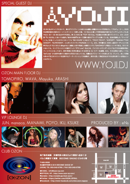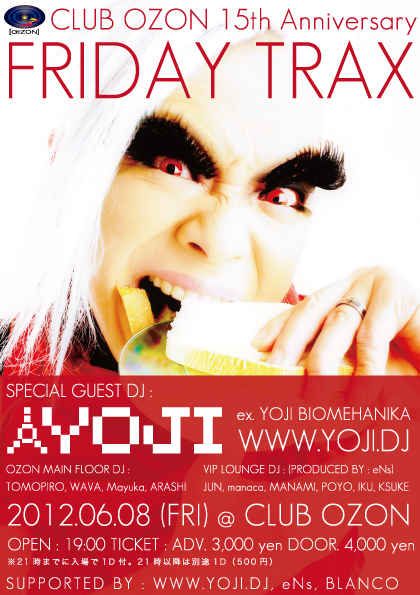 OZON 15th Anniversary presents ◆FRIDAY TRAX Special◆ @ CLUB OZON ■2012.06.08.Fri TECH DANCE, TRANCE,HARD HOUSEファンの皆様お待たせ致しました!! 3年の時を経て世界を飛躍するスーパースター、「YOJI (ex. YOJI BIOMEHANIKA)」を招聘しての開催!!過去にもGUEST DJに「REMO-CON」、「NISH」、「DJ OZAWA」などとBIG GUESTを招聘して毎回驚異的な反響のこのパーティー!! LightingもSpecialな演出でお届け致します!! さらには今回特別にVIP Roungeを大解放!! VIP RoungeではeNs presentsによるまた新たなパーティーが…。 2フ