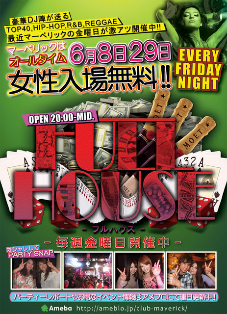 6/8 (金)【女性完全無料】マーベリック http://mixi.jp/view_diary.pl?id=1848512301&owner_id=50165767 オープン8:00〜1:00まで ■なんと6月8日は女性入場無料■ マーベリックのmixi日記から画像を保存すれば、男性も画像割引で1000円2ドリンク付きで入場可能。 どこよりもリーズナブルに豪華なDJ陣で最高に盛り上がるパーティーをお届けしている金曜日のマーベリック。東海地区の有名DJがHIP-HOPをメインに間違いないクラブミュージックで更に盛り上がって来ています!! ■毎週金曜日『FULL HOUSE』 HIP-HOP, R&B, REGGAE ALL