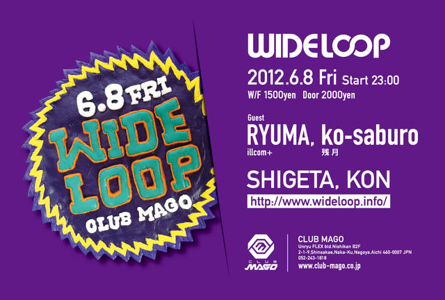 houseを軸に、自由に繰り広げられる音楽と共に 海、山、箱... あらゆる気持ちのいい空間を探求する 次回 2年ぶりclub MAGOにて開催される。 6.8(fri) wideloop@club MAGO start23:00 with flyer1,500yen door2,000yen Guest Dj: RYUMA (illcom+) , ko-saburo(残月) Dj: Shigeta, Kon iFLYER: http://iflyer.tv/club-mago/event/106060-wideloop/ wideloop: http://www.wideloop.info club MAGO: http://club-mago.co.jp/