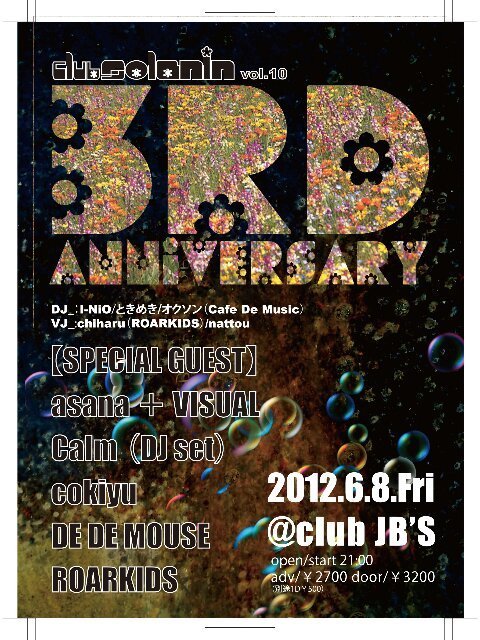 club solanin vol.10 〜3rd Anniversary〜 2012.6.8. Fri @club JB'S open/start 21:00 adv/door \2700/\3200 (別途1D代500円) DJ_ I-NiO ときめき オクソン(Cafe De Music) VJ_ chiharu(ROARKIDS) nattou 【SPECIAL GUEST】 asana +VISUAL cokiyu DE DE MOUSE (NEW) Calm(NEW) ROARKIDS ■DE DE MOUSE チベット、インドネシアなどの民族音楽の歌、子供の声からソウルフルなヴォーカルまで、多彩な素材を緻密にチョップ&エディットした印象的なメロディ。 独特なコード進行の上を飛び交うきらびやかなシンセ