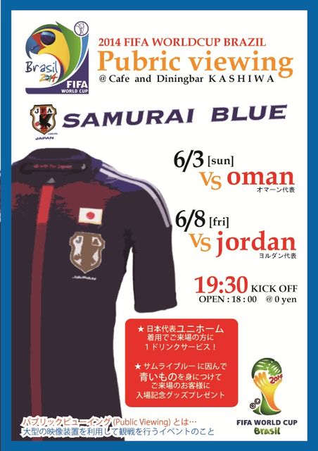 2014 FIFA WORLD CUP BRAZIL Pubric viewing @ Cafe and Diningbar K A S H I W A 6/8[fri] vs ヨルダン代表 OPEN : 18 : 00  KICK OFF 19:30 @ 0 yen ★ 日本代表ユニホーム 着用でご来場の方に 1ドリンクサービス! ★ サムライブルー に因んで 青いものを身につけて ご来場のお客様に 入場記念グッズプレゼント パブリックビューイング(Public Viewing)とは… 大型の映像装置を利用して観戦を行うイベントのこと ご予約・お問い合わせは・・・ 0288−22−5876 珈茶話まで