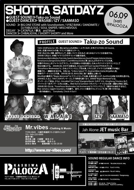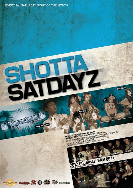 SHOTTA SATDAYZ 6/9(土)千葉・柏@PALOOZA OPEN 11pm〜 MEN:\2000-1D LADIES:\1500-1D 【GUEST SOUND】 TAKU-ZO SOUND 【GUEST DANCER】 WASABI / IZY / SAAMASO 【SOUND】 VYBZ BANK / DANDIMITE / FABULOUS / MISCHIEVOUS / SOUL SNIPER / BIG ONE STONE with SOUND SYSTEM 【DEE-JAY】 CATAPILA / 拳太 【DANCER】 CHIBALI GYAL / SHORTY SHORTY PALOOZA 千葉県柏市柏3-2-22 林ビル2F TEL 04-7136-2111
