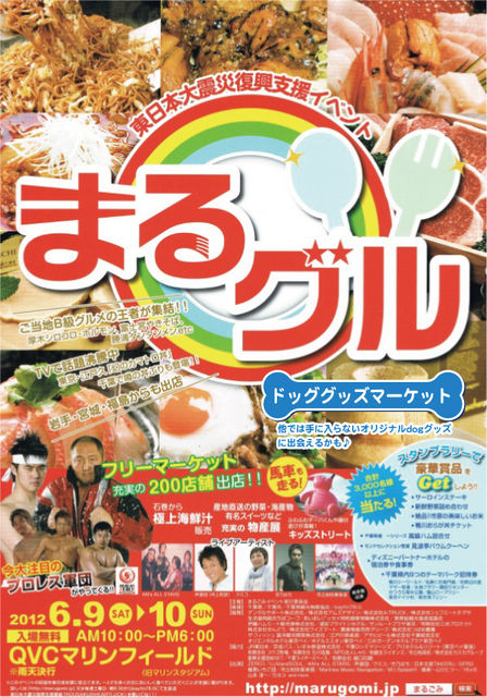 まるグル 2012年6月9・10日(土日) 10:00〜18:00 雨天決行 入場無料 QVCマリンフィールド(旧マリンスタジアム) PRストリート内にドッググッズマーケット 『まるグル』でわんちゃんと一緒においしいものを満喫!!