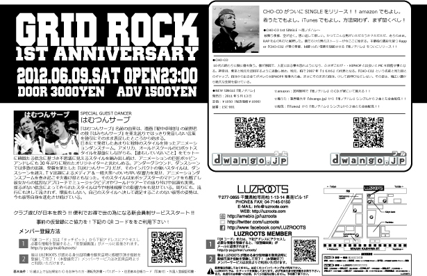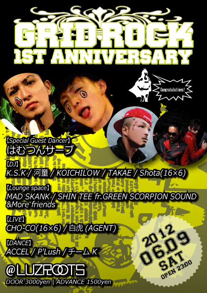 告知失礼します。 ゲスト取れますので気軽にメッセージください! 2011年6月9日(SAT) 『GridRocK』vol.6 〜1st Anniversary〜 @柏LUZROOTS(元waRter) OPEN 23:00〜CLOSE MID 当日 3000円 前売り 1500円 【Special Guest】 はむつんサーブ 【DJ】 K.S.K 河童 KOICHILOW TAKAE Shota(16×6) 【Lounge space】 MAD SKANK SHIN TEE fr.GREEN SCORPION SOUND &More friends 【LIVE】 CHO-CO(16×6) 白虎(AGENT) 【DANCE】 ACCEL 【CLUB LUZROOTS】 〒277-0855 千葉県柏市南柏1-