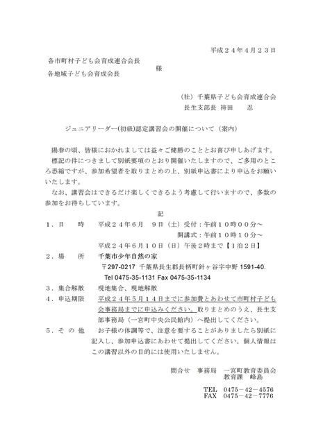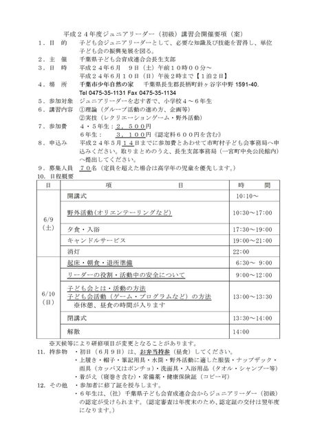 長生支部主催「ジュニアリーダー初級認定講習会」が開催されます。 日時:9日10時受付〜10日14時解散 (千葉市少年の家の現地集合解散) 対象:小学4年生〜6年生 参加費:2,500円 6年生は3,100円(認定料含む) 近隣の市町村のお友だちと仲良くなり、グループ活動の進め方や企画作り レクリエーションや野外活動をし、リーダーとしての知識や技術を身に付けてもらい、MKL(茂原子ども会リーダーズクラブ)の仲間になってもらえると嬉しいです 詳しくは、生涯学習課 大本さんまでお願い致します。