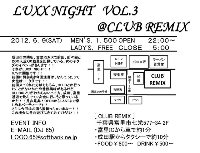 6/9の土曜日に成田市の隣街、富里REMIXで前回、前々回と200人近くの動員を記録している、女の子 タダのイベントがあります!! それがLUXX NIGHT!! 前回に引き続き今回注目は、なんてったって 女性は・・・タダです!! 前回来てくれた方はもちろん、CLUBとか行ったことがないかた や普段興味があるけどCLUBのノリがわからないって方もこの機会に 是非遊びにきてみてください!! それに今回はDANCE SHOW CASEも加わりガッツリパワーアップした LUXX NIGHTになることは間違いないです! さらに今回はお酒も振舞っちゃい