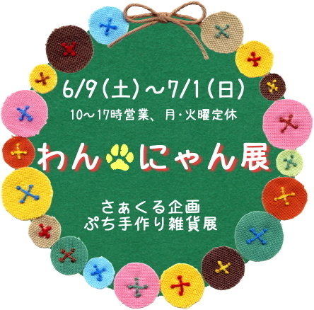 6/9(土)〜7/1(日) 奈良市内の手作り雑貨のお店「さぁくる*」にて、 17組の作家さんによる犬と猫をモチーフにした、 ぷち手作り雑貨展「わんにゃん展」を開催します! 出展作品は、あみぐるみ・羊毛フェルト・アクセサリー・ 布小物・消しゴムはんこ・ガラス細工・スイーツデコなど、 全て手作りの作品です。 当店さぁくる*は、奈良市内の東大寺や奈良公園からも近いので、 奈良観光・散策も兼ねて、 是非愛らしいわんちゃん・ねこちゃん雑貨に会いに来て下さい♪ ※常時、140名以上の作家さんの手作り雑貨もお取り扱いしています。