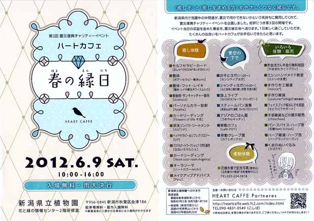 ハートカフェ 春の縁日 〈癒し手〉と〈癒しを求める方〉をやさしくつなぐ縁日です。 新潟県内で活躍中の仲間達が、 震災で何かできないかという気持ちに賛同してくれて、 震災復興チャリティイベントを企画しました。 好評につき第3回の開催です。 イベント当日の収益を含めた募金を、震災被災地へ送ります。 一日楽しく過ごしていただき、 たくさんの出会いをハートカフェがお手伝いできたらと思います。 日時:6月9日(土) 10:00〜16:00 入場無料 雨天決行 会場:新潟県立植物園