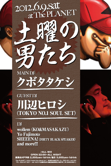 ★6/9(土) [ 土曜の男たち ] - MAIN DJ - クボタタケシ - GUEST DJ - 川辺ヒロシ (TOKYO NO.1 SOUL SET) ♪ALL MIX OPEN 22:00〜ALL NIGHT 前売&HP予約 2,500yen-1drink 当日 3,000yen-1drink @The PLANET [ http://www.the-planet.jp/ ] 新潟市中央区万代1-3-1 万代シネモールビルB1 TEL: 025-247-3511 ※オールナイト公演のため18歳未満(高校生)入場不可 [ ID CHECK有り ]