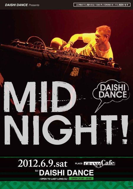 DATE: 6月9日(土) [NIGHT] TIME: 21:00 ~ 01:00 PRICE: 3,000YEN/W1D 22時までに入場の方は1500YEN/1D GENRE: House ARTISTS: ■DJ■ DAISHI DANCE(LONG DJ SET) http://grandcafeosaka.com/venue/flyer/106218