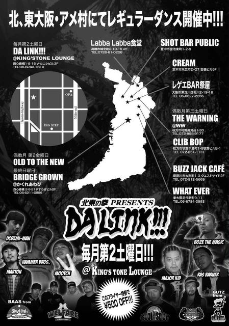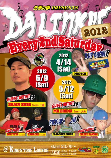 今月もやってきました〜 このDANCE!!! 毎月第二土曜日は KING'STONE LOUNGEの鉄板イベント、、、 DA LINK!!!2012 梅雨入り間近の今月は 三重県からVIBES満タンの このTHREE MENSが登場します(^O^)/ 多数のクラッシュに出場し 全国各地のイベントにも出演!! 東北の被災地へと赴き backupにも精力的に参加している 言わずと知れた三重のBIG BOSS SOUND、、、 BRAIN BUSS 出会いは大阪でしたが 最近は、三重に活動拠点を移し 全国に殴り込みをかける RAGGA