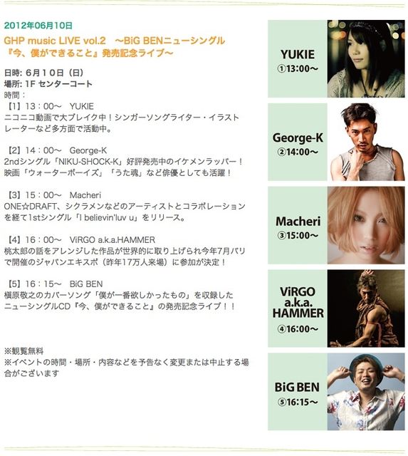 GHP music LIVE vol.2 〜BiG BENニューシングル『今、僕ができること』発売記念ライブ〜 日時: 6月10日(日) 場所: 1F センターコート 時間: 【1】13:00〜 YUKIE ニコニコ動画で大ブレイク中!シンガーソングライター・イラストレーターなど多方面で活動中。 【2】14:00〜 George-K 2ndシングル「NIKU-SHOCK-K」好評発売中のイケメンラッパー!映画「ウォーターボーイズ」「うた魂」など俳優としても活躍! 【3】15:00〜 Macheri ONE☆DRAFT、シクラメンなどのアーティストとコラボレーションを経て1stシングル「I bel