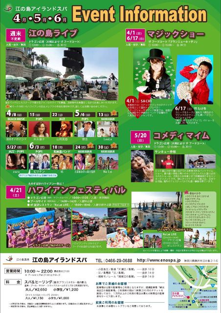 2012.6.10(日) 【結】 「結 in エノスパ!」 場所:江ノ島アイランドスパ ドラゴン広場(天候により1Fフードコート) 時間:13;00〜/15:00〜(各30分) 料金:無料 出演: 【結】 はなわちえ / 津軽三味線 柿木原こう / 箏 辻本好美 / 尺八
