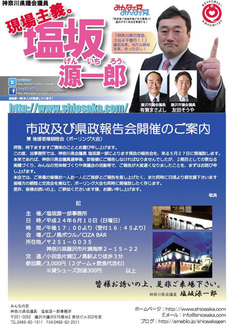 塩坂源一郎県政報告会及び有賀正義、友田宗也市政報告会&ボウリング大会開催のご案内 この度、6月10日に、みんなの党神奈川県議会第3支部及び 神奈川県議会議員塩坂源一郎後援会の主催で、塩坂源一郎県政報告会、藤沢市議会議員有賀正義、友田宗也による市政報告会、ボウリング大会、そして懇親会と盛りだくさんでイベントを開催致します。 皆様、お誘い合わせの上、是非とも、ご参加くださいます様、よろしくお願い致します。 日時 6月10日(日曜日) ◎ボウリング大会 会場 江の島ボウル 17時より(開場16時45分) ◎参